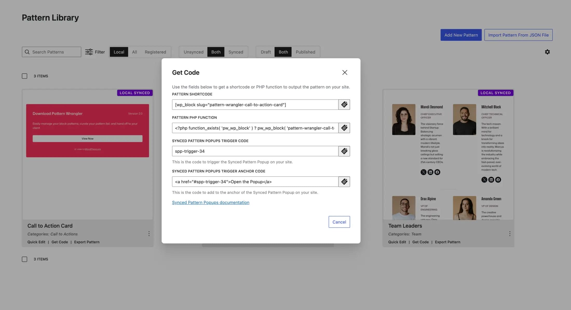 Pattern Wrangler has a specific integration so that if you choose to get the display code for a synced pattern, you’ll see an extra option for copying the Synced Pattern Popups trigger code.