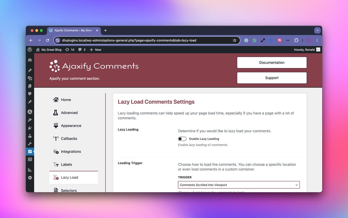 You’ll see several options to configure lazy loading, such as what triggers it. For more on the Ajaxify Comments lazy loading settings, please visit the lazy load documentation.
