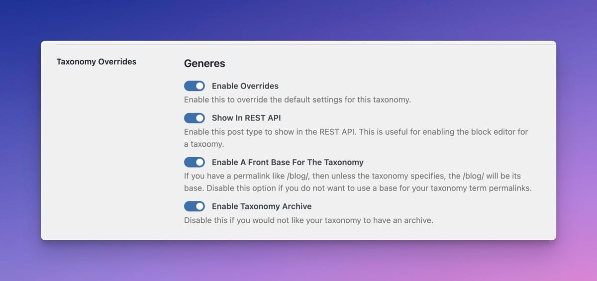 The Admin Settings Allow for Advanced Post Type Overrides and More