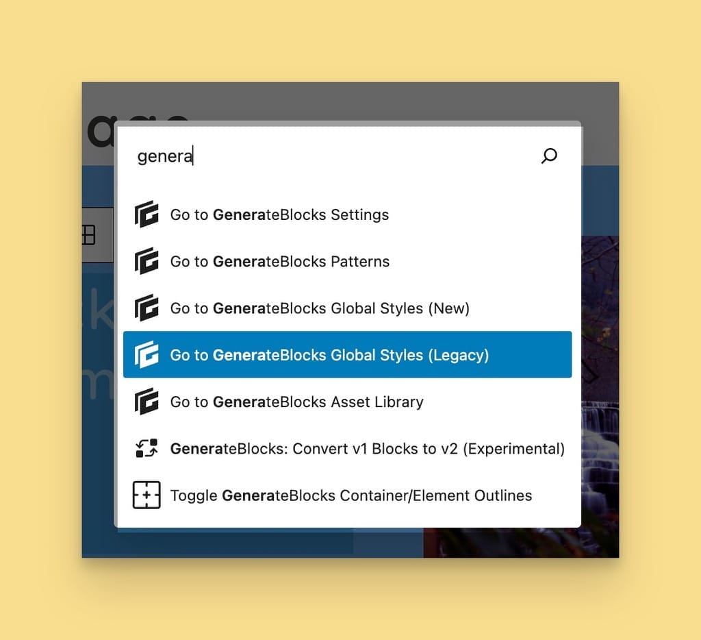 With the Command Palette in the block editor, you have access to numerous shortcuts to GenerateBlocks admin settings. You can also toggle outlines for all Container blocks, and do a bulk transform of v1 blocks to v2.