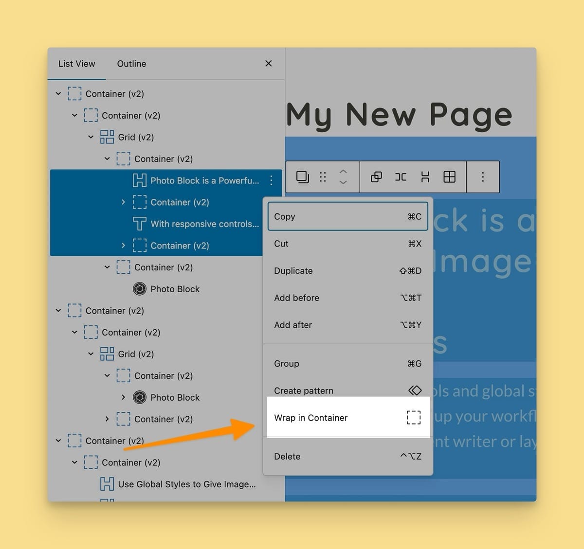 GenerateBlocks can wrap its own blocks, but not when you’ve selected multiple un-related blocks. This handy shortcut allows you to wrap any group of blocks in a container.