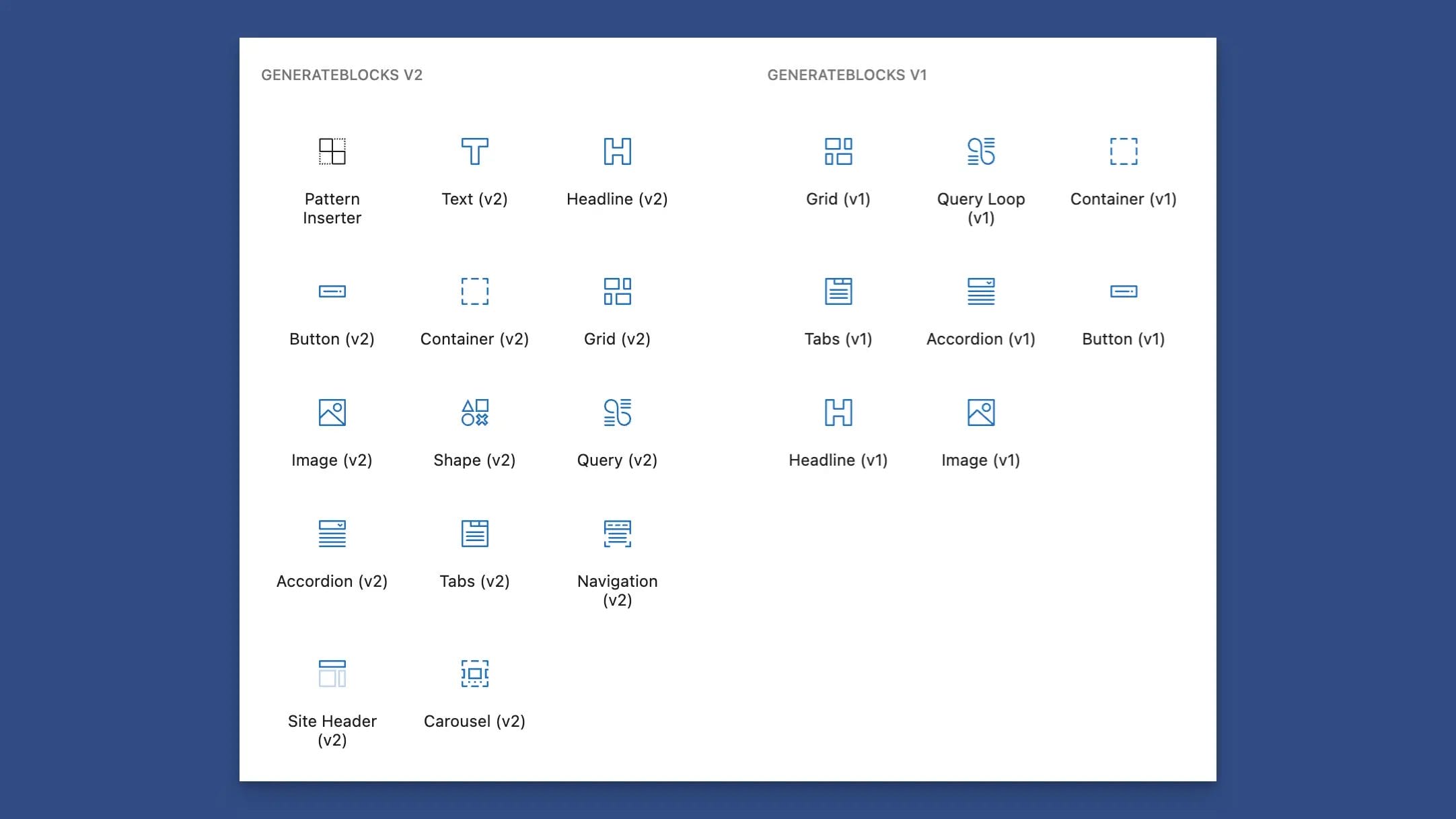 If you still have Version 1 GenerateBlocks blocks, you can show v1 and v2 together, with labels.