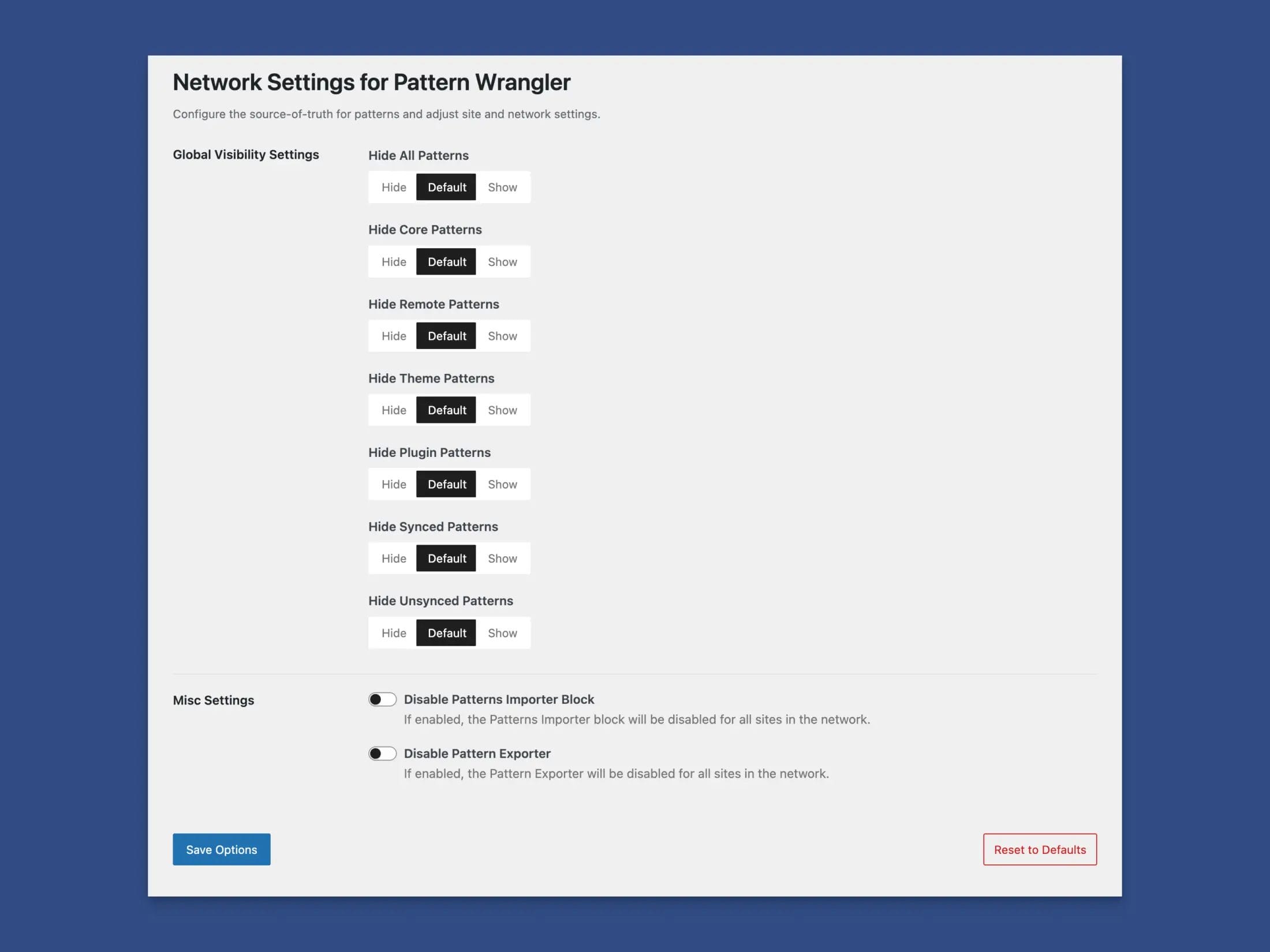 With Pattern Wrangler, a free plugin, you can quickly hide core, remote, plugin, and theme patterns, instantly freeing up your pattern library. Additional features include disabling registered patterns individually, allowing for a fine-tuned selection of patterns.