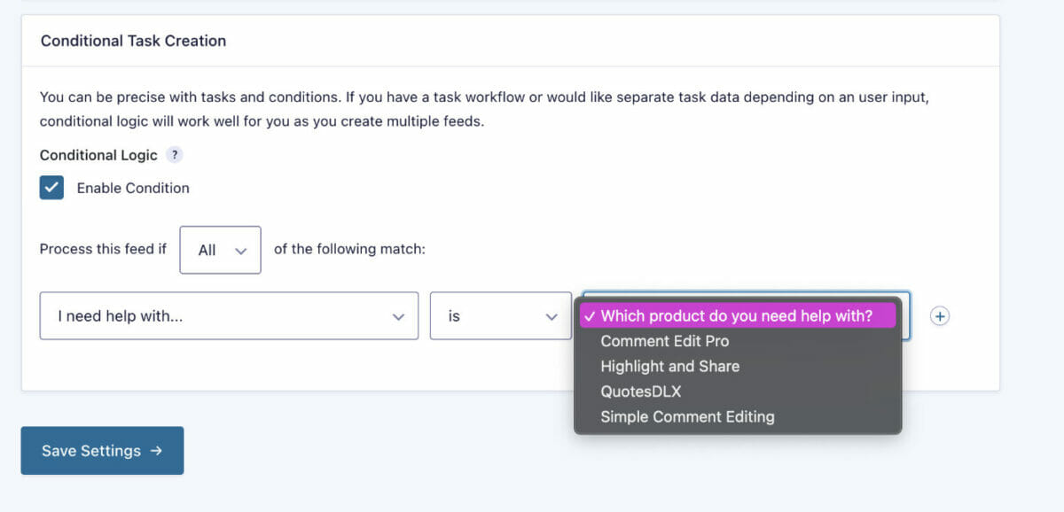 With a direct integration with Gravity Forms, you can create tasks in projects right from a form entry. This can aid if you are doing plugin support, accepting wedding RSVPs, newsletter sign-ups to track follow-ups, and much more.