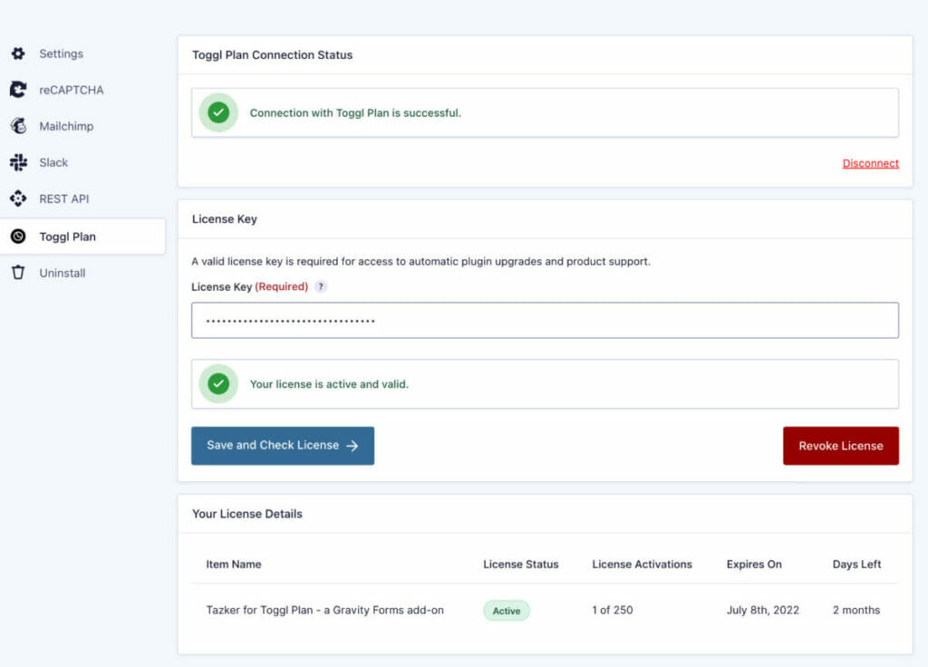 From there, you can enter your details into the Gravity Forms settings and you will be connected automatically to Toggl Plan.
