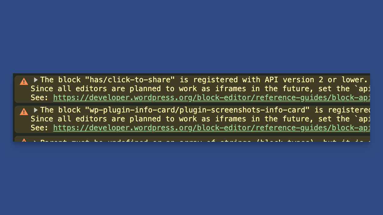 In preparation for this move and to be proactive, WordPress 6.9 installs began showing a deprecation notice for blocks still using Version 2 or earlier. These appear in the browser’s developer console.