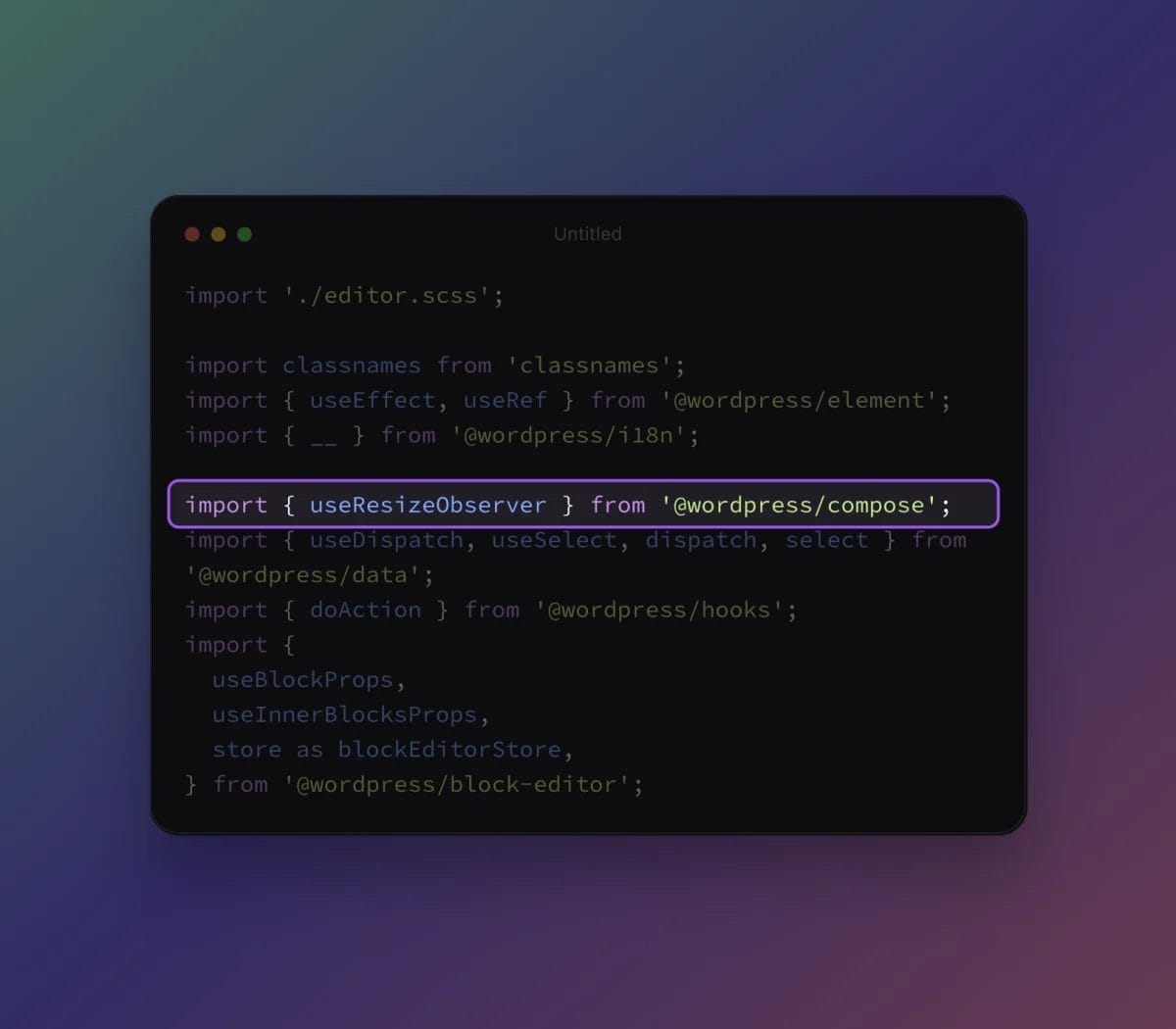import { useResizeObserver } from '@wordpress/compose';Code language: JavaScript (javascript)Sample Block Import Statement With useResizeObserver Import