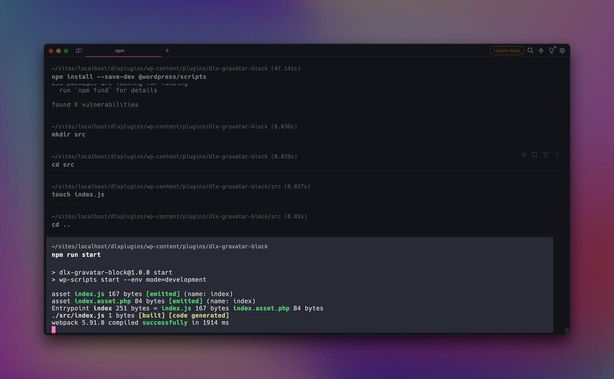 npm run start– Start a development and watch build of our plugin’s scripts.npm run build– Build a production build of our plugin’s scripts.npm run zip– Build a shippable ZIP file of our block.