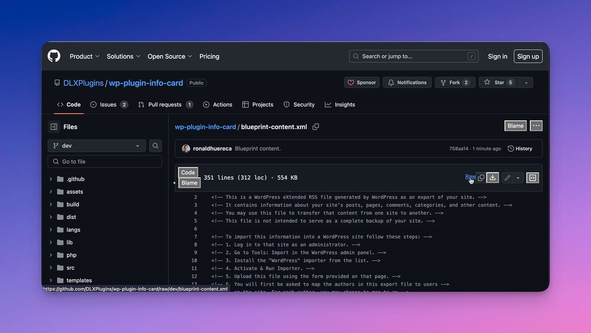https://raw.githubusercontent.com/DLXPlugins/wp-plugin-info-card/dev/blueprint-content.xmlCode language: JavaScript (javascript)Now, we can create a new step, which will download the content from the hosted XML file.
