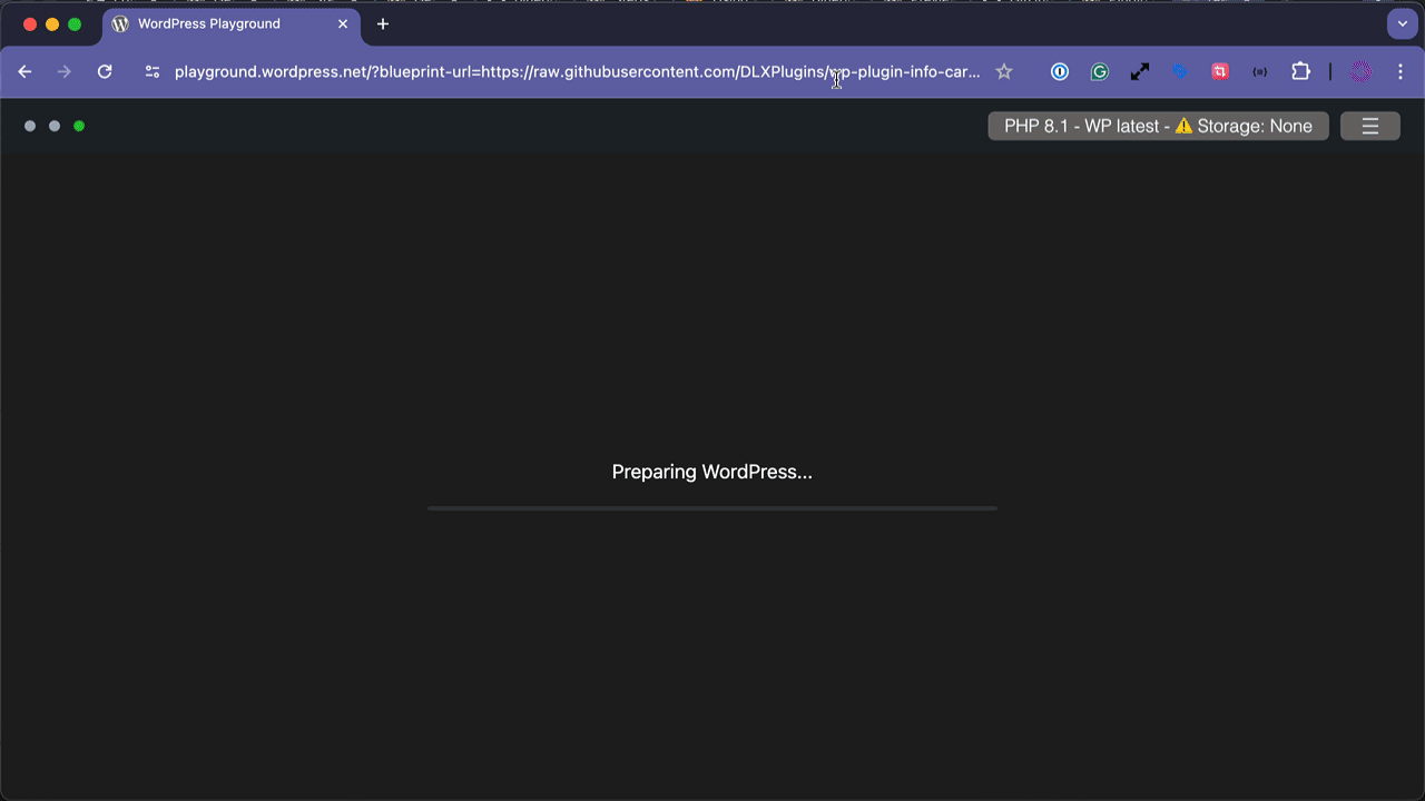https://playground.wordpress.net/?blueprint-url=https://raw.githubusercontent.com/DLXPlugins/wp-plugin-info-card/dev/blueprint.jsonCode language: JavaScript (javascript)