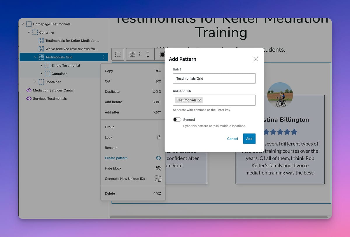 Synced patterns can be a life-saver, especially if you’re re-using common elements. However, if you need to change patterns from page to page, then Synced patterns will not work for you and you’re better off with Unsynced patterns.